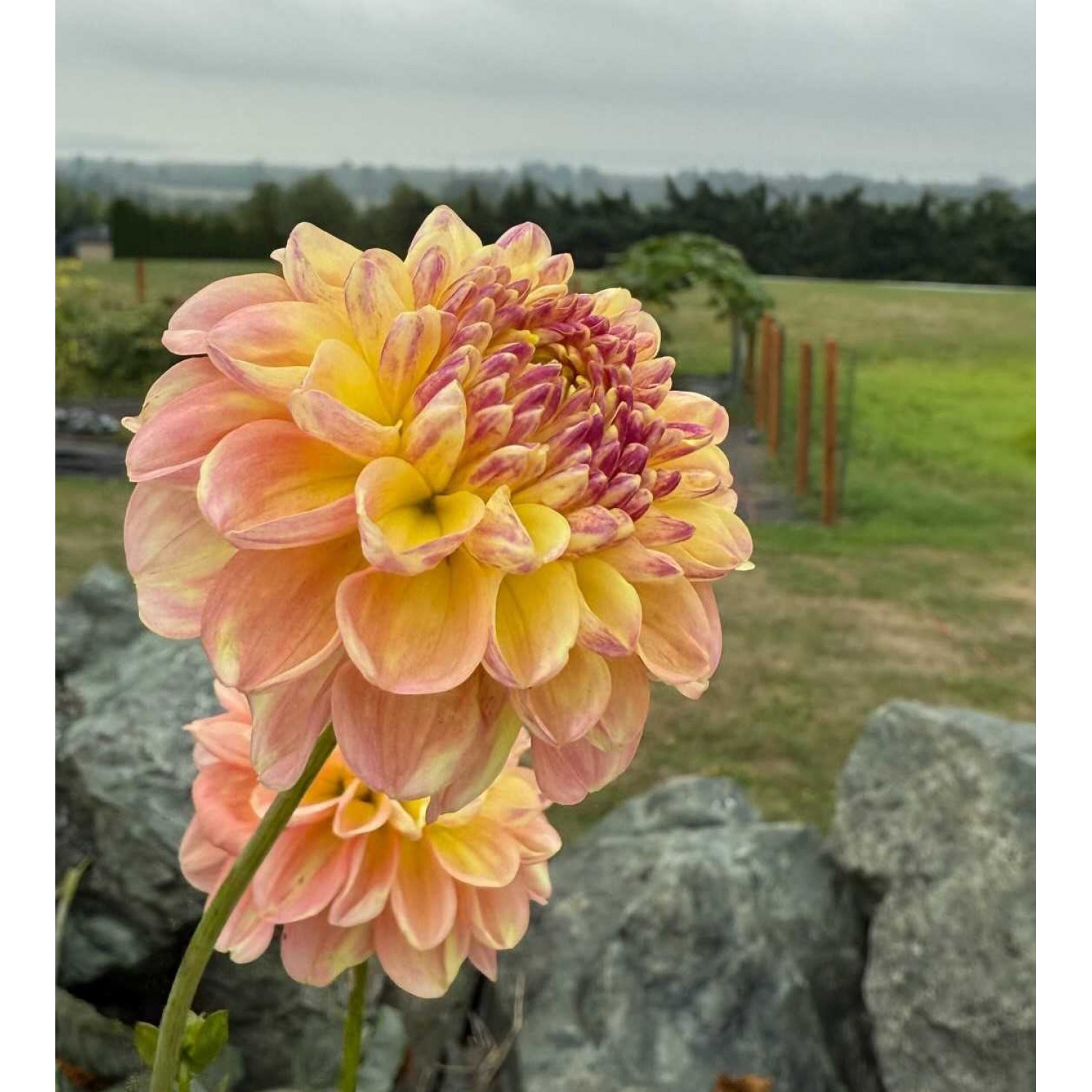 Lemon yellow to sherbet orange blooms. Formal decorative with a ruffled center. Love the ombre look on this one.