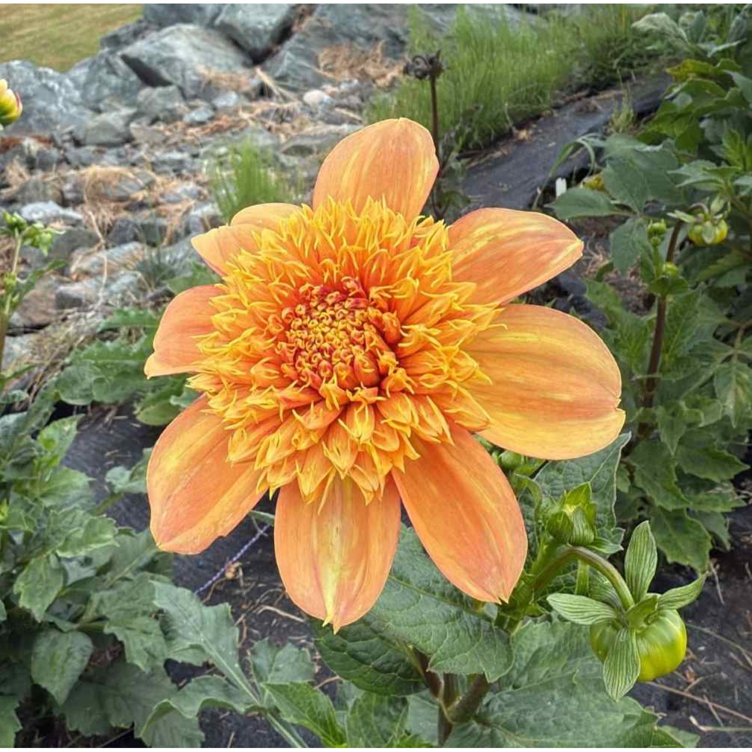 Golden peachy unique anemone dahlia.